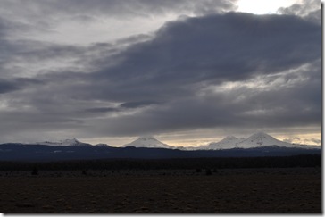 Sunday morning we got up and fixed ourselves breakfast in our deluxe suite’s kitchen. We checked the weather and it was in the upper 30s with temps rising gradually throughout the morning. The sky was partly cloudy and it looked like we were going to stay dry which is always a treat. I wore capri tights, a short-sleeve shirt, arm warmers and gloves. We both also carried Gu and our own water since there were only 3 or 4 aid stations out there several miles apart. We drove the short distance to the start at Sisters Middle School and used the restrooms in the gym. We waited in there until 10 minutes before 9:00 and walked to the start. There were less than a couple hundred people doing the 20 miler (the 40 milers took off an hour earlier) so it was intimate. We listened to the instructions (“follow the yellow Montrail ribbons”) and then we were off!
